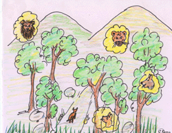 అలా పోతూ పోతూ ఉంటే సింహం ఎదురౌతుంది. అపుడు సింహం " ఇటుగా ఒక మేక పోయింది. నీవు ఏమైనా చూశావా" అన్నది. అపుడు ఆ గుమ్మడి కాయ "లేదు లేదు నేను వచ్చేదారిలో నాకు ఎవ్వరూ కనబడలేదు." అన్నది.