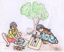 వెంటనే ఇద్దరూ ఉత్సాహంగా పనిలోకి దిగారు. జ్యోతి ఇంటికి పరుగెత్తి వాళ్లమ్మ నడిగి ట్రంకు పెట్టెలో ఉన్న పాత ధోవతీని బయటికి తీసింది. రాజు అడవికి పోయి దొండతీగ ఆకులు, గరకమాకులు, దొండ పండ్లు, నాగజెముడు-పాపచ్చికాయలు కోసులు వచ్చాడు. వాళ్లమ్మ సూది-దారంతో బట్టను సరైనవిధంగా మడిచి జెండా ఆకారంలో కుట్టిపెట్టింది. ఇద్దరూ కలిసి కూర్చుని, బట్టను మూడు భాగాలుగా చేశారు. దొండపండ్లు, నాగజెముడు పండ్లను బాగా పిసికి పై భాగంలో రుద్దారు. బండమీద ఆకుల్ని బాగా మెత్తగా నూరి ఆ పసరును జెండా క్రింది భాగానికి పట్టించారు. జ్యోతి ఈతబర్రను సన్నగా చీల్చి, దాన్ని బ్రష్ గా వాడుతూ, ఇంకుతో జెండా మధ్యలో చక్రాన్ని గీసింది. అంతే, ముచ్చటైన జెండా తయారైంది! మా ఆనందానికి అవధులు లేవు.