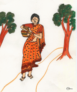 అయితే ఆమె చేతిలోంచి బిందె జారి నూతిలో పడిపోయింది. బిందె పోగొట్టుకున్నందుకు ఆమె చాలా బాధపడింది- లోతుగా ఉన్న బావిలోకి దిగలేక ఏడిచింది. అప్పుడు ఆ బావిలోంచి గంగా దేవత ప్రత్యక్షమైంది. ఆమె తన చేతిలో ఒక బంగారు బిందెను పట్టుకొని ఉన్నది. ’ఇదేనా, నీ బిందె? బంగారు బిందె?’ అని అడిగింది. ’కాదు’ అన్నది చిన్న ఆయమ్మ. గంగా దేవి వెళ్లి, ఈసారి ఇత్తడి బిందెతో తిరిగి వచ్చింది: ’ఇదేనా నీ బిందె? ఇత్తడి బిందె?’ అని అడిగింది. ’కాదు’ అన్నది చిన్న ఆయమ్మ. మళ్లీ గంగాదేవి వెళ్లి, ఈసారి ఆయమ్మ బిందెతోనే తిరిగి రాగానే, చిన్న ఆయమ్మ ’అదే, అదే, నా బిందె!’ అన్నది. ఆ దేవత ఆయమ్మ మనసును తెలుసుకొని చాలా సంతోషపడింది. ’ఈ మూడు బిందెలూ నువ్వే తీసుకో, చాలా మంచిదానివి’ అన్నది. అని, ఆయమ్మకు మూడు బిందెలూ ఇచ్చేసింది. చిన్నాయమ్మ మూడు బిందెలూ పట్టుకొని సంతోషంగా ఇంటికి తిరిగి వచ్చింది.