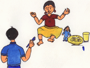 అక్కా పెట్టూ - చుక్కా బొట్టు అవ్వా నాకూ - బువ్వా పెట్టు అమ్మానాకూ - బొమ్మా ఇవ్వు నాన్నా నాకూ - పెన్నూ ఇవ్వు