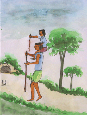 అనగనగా ఇద్దరు మిత్రులు ఉండేవారు. ఇద్దరూ కలిసి అడవిగుండా ఆ పక్క ఊరికి వెళ్దామనుకున్నారు. దారిలో వారికి ఒక పెద్ద నల్లతాడు, ఒక అగ్గిపెట్టె దొరికాయి. ఇంకొంచెం దూరం పోగానే వారికి పుండుతో బాధ పడుతున్న ఒక గాడిద దొరికింది. దానిని నడిపించుకొని పోతుంటే వారికి దారిలో ఒక సున్నం డబ్బా, గడ్డపార కూడా దొరికాయి. ఇంతలో చీకటి పడింది. ’ఎట్లా’ అనుకుంటుండగానే ఒక గుహ కనిపించింది. దానిలో నిద్రపోదామనుకున్నారు. కానీ దానిలో దయ్యాలున్నాయి వారికేమో తెలియదు. ఒక తలుపు ఉంటే లోపలికి వెళ్ళి గొళ్ళెం పెట్టుకున్నారు. బయటినుండి రెండు దయ్యాలు వచ్చి తలుపు తీయమని అరవడం మొదలు పెట్టాయి. అవి ఎంత అరిచినా వీళ్లు తలుపు తెరవలేదు. అప్పుడు దయ్యాలు ’మీరు ఎవరు?’ అని అడిగాయి. వారు "మేము దయ్యాలము" అని చెప్పారు. "మిమ్మల్ని ఎలా నమ్మాలి?" అని అడిగాయి అవి. "మమ్మల్ని నమ్మాలంటే మా జుట్టు చూడండి" అని వాళ్ళు నల్లతాడును బయటికి చూపారు. "ఇంకా కావాలంటే మా ఉమ్మిని చూడండి" అని సున్నండబ్బాని కిటికీలోనుండి బయటికి వంచారు. దానితో బయటి దయ్యాలు భయపడ్డాయి. "మీ అరుపును వినిపించండి" అన్నాయి దయ్యాలు మళ్ళీ. వాళ్ళు అగ్గిపెట్టెతో నిప్పురాజేసి, గడ్డపారను ఎర్రగా కాల్చారు. దానితో గాడిద పుండును కాల్చారు. అది గట్టిగా అరిచి తలుపు విరిగేటట్లు ధనధనా తన్నింది. దాని వెనకే పరుగెత్తుకొచ్చిన మిత్రులిద్దరూ బయటికి దూకి, తమ చేతిలోని గడ్డపారతో దయ్యాల వెంటపడ్డారు. అవి రెండూ భయంతో తోకముడిచి పరుగుపెట్టాయి.