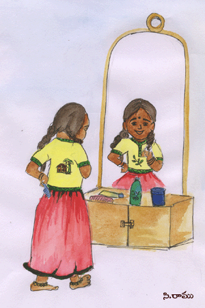 అద్దంలొ ఎవరమ్మా, ముద్దుమొగం బొమ్మ! నేనెట్ల దువ్వితే తానట్లె దువ్వు నేనెట్ల నవ్వితే తానట్లె నవ్వు