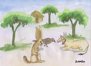 ఒక ఊరిలో ఒక అవ్వ ఉండేది. ఆ అవ్వకు ఒక కోయిల ఉండేది. అవ్వ కోయిలను చాలా బాగా చూసుకొనేది. ఒక రోజు అవ్వకు జ్వరం వచ్చింది. అపుడు కోయిలకు ఏమి చేయాలో అర్థం కాలేదు. అప్పుడది చాలా ఆత్రంగా తన మిత్రుడయిన కుందేలు దగ్గరికి వెళ్ళింది. కుందేలును కలిసింది. అప్పుడు, కుందేలు వచ్చిన మిత్రుడిని ఆప్యాయంగా పలకరించి, కోయిల రాకకుగల కారణాన్ని అడిగింది. అవ్వకు జ్వరంగా ఉన్న సంగతి చెప్పింది కోయిల. ’అవునా ! అరె ! పద..పద..పోదా’మని కుందేలూ, కోయిలా అవ్వదగ్గరికి వెళ్ళాయి. అవ్వను చూశాక కుందేలు, ’మిత్రమా ! నువ్వేమీ భయపడకు. ఈ జ్వరం ఇవ్వాళ కాకపోతే, రేపు పోతుందిలే! మరి నేను వెళ్ళి రేపు మళ్ళీ వస్తా’నని చెప్పి, వెళ్ళిపోయింది.