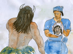 " నీకు ఇల్లు చూపించడం వరకూ చేయగలను. కానీ దూరంనుండే. ఈ వరి పొలం పని పూర్తయ్యేంతవరకూ నా మొహం అతనికి చూపించలేను " అంటూ, మంగలి ఇంటికి దారి చూపించాడు మొదటి బ్రహ్మరాక్షసుడు.