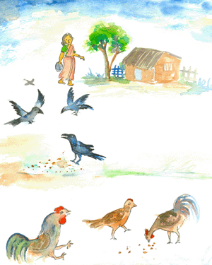 అమ్మ మెతుకులు చల్లింది కాకి ఒకటి చూసింది కావూ కావని అరిచింది కాకుల మూకను రమ్మంది ఆకలితీరా కాకుల గుంపు అన్నం మెతుకులు తిన్నాయి అమ్మ గింజలు చల్లింది అన్ని కోళ్ళను రమ్మంది వచ్చిన కోళ్ళు గింజలకోసం ఒకదాన్నొకటి తరిమినవి కాకుల ఒద్దిక కోళ్లకు లేదని లోకులకంతా తెలిసినది.