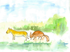 అనగనగా ఒక అడవి. ఆ అడవిలో ఒక నక్క. నక్క అంటే "జిత్తులమారిది" అని అందరికీ తెలుసు. కానీ ఈ అడవిలోని నక్క జిత్తులమారిదే కాక, మహా బద్దకపు నక్క కూడానూ. కూర్చున్న చోటికే తిండి రావాలి, దగ్గరగా వచ్చిన జంతువులనే చంపి తింటుంది. ఒకసారి నాలుగైదు రోజులుగా దానికి తిండి దొరకలేదు. ఏ జంతువూ దొరక్క, ఆకలితో నీరసం వచ్చింది దానికి. ఇక నడవలేకపోయింది. ’ఇలాగే ఇంకో రెండు రోజులు తిండి దొరక్కపోతే నా పని అంతే’ అనుకుంది నక్క.