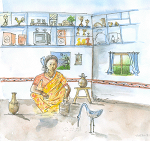 దాంతో ఆ దంపతులిద్దరూ హతాశులయ్యారు. కానీ ఏమి చేయగలరు? తమకు పుట్టిన బిడ్డాయె! అందరూ వారికి పుట్టిన ఆ కొంగను చూసి వాళ్లను ఎగతాళి చేసేవారు. అయినా చేసేది లేక వాళ్ళా కొంగనే పెంచుకోసాగారు. కొన్నాళ్ళకు ఆ కొంగ పెరిగి పెద్దదయింది. సరిగ్గా అప్పుడే ఆ ప్రాంతంలో పెద్ద కరువు వచ్చింది. మనుషులకు పుట్టిన ఆ కొంగకు గొప్ప గొప్ప శక్తులు వచ్చాయి. అది ఆకాశంలోకి ఎగిరి, దూర ప్రాంతాలలో దొరికే మంచి మంచి పళ్ళూ, కూరగాయలూ వాళ్ల అమ్మా-నాన్నలకు తెచ్చి ఇచ్చేది. అయినా వారికి తీరని బెంగ కొంగ సంతానం. ఆ బెంగతోటే కొంగవాళ్ల అమ్మ మంచాన పడింది. కొంగకు అది చాలా బాధను కలిగించింది. ’అందుకు కారణం తనేకదా’ అని, అది ఆకాశంలో చాలాచాలా ఎత్తుకు ఎగురుకుంటూ పోయి, చివరికి చందమామ దగ్గరికి చేరుకొని తన కష్టాన్ని చెప్పుకొంది.