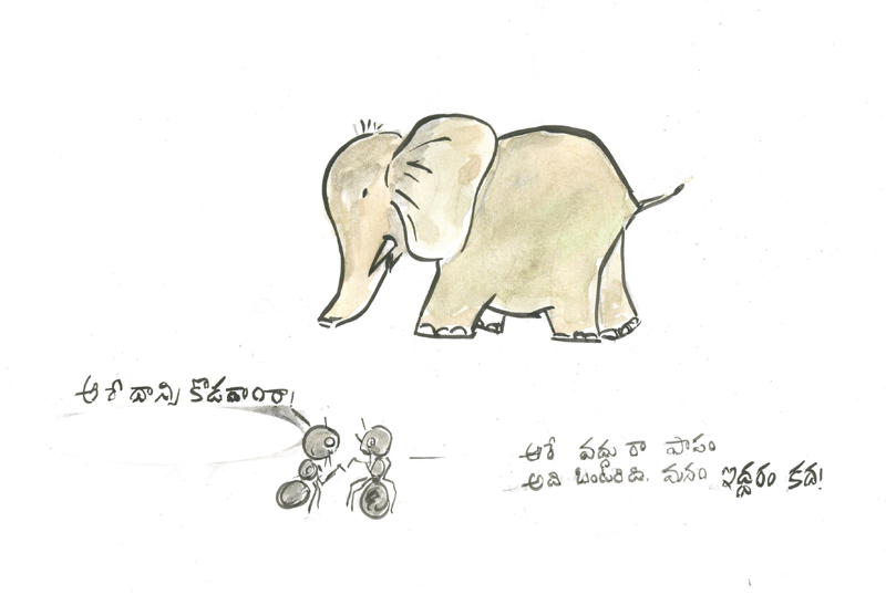 దారివెంట రెండు చీమలు వెళ్తున్నాయి. వాటికి ఎదురుగా ఒక ఏనుగు వస్తున్నది.