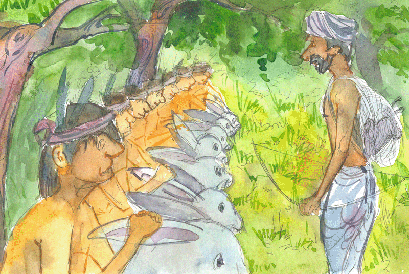 అట్లా వేటాడుతూ వేటాడుతూ అడవిలో చాలా లోపలికి వెళ్లిపోయాడు అతను. పోతూపోతూ ఉంటే అతనికి ఒక పెద్ద ఊబి అడ్డం వచ్చింది. అతను కష్టపడి దాన్ని దాటుకొని ఇంకా ముందుకు పోతే ఒక చదునైన ప్రదేశం ఎదురైంది. అక్కడ కనిపించిన దృశ్యం అతన్ని ఆశ్చర్యచకితుణ్ని చేసింది. ఏడు కుందేళ్లు, పైన ఎక్కి కూర్చునేందుకు వీలుగా జీను వేసుకొని అక్కడ వరసగా నిలబడి ఉన్నాయి!