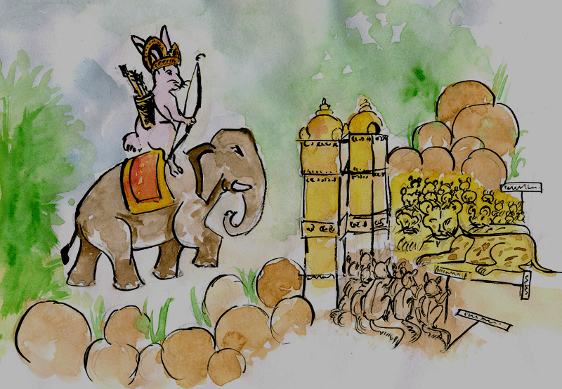 ఏనుగు పూర్తిగా తయారై, రాజుగారిని అంబారీమీద ఎక్కించుకొని, కోట తలుపులు తెరిచి, ముందుకు ఉరికింది. ఎదురుగా పులీ, నక్కా తమ సైన్యాలను మోహరించి నిలబడి ఉన్నాయి. ఏనుగు వాటికి ఎదురుగా నిలబడి, కుందేలు మహారాజు వేస్తానన్న శరపరంపరలకోసం ఎదురుచూస్తున్నది.
