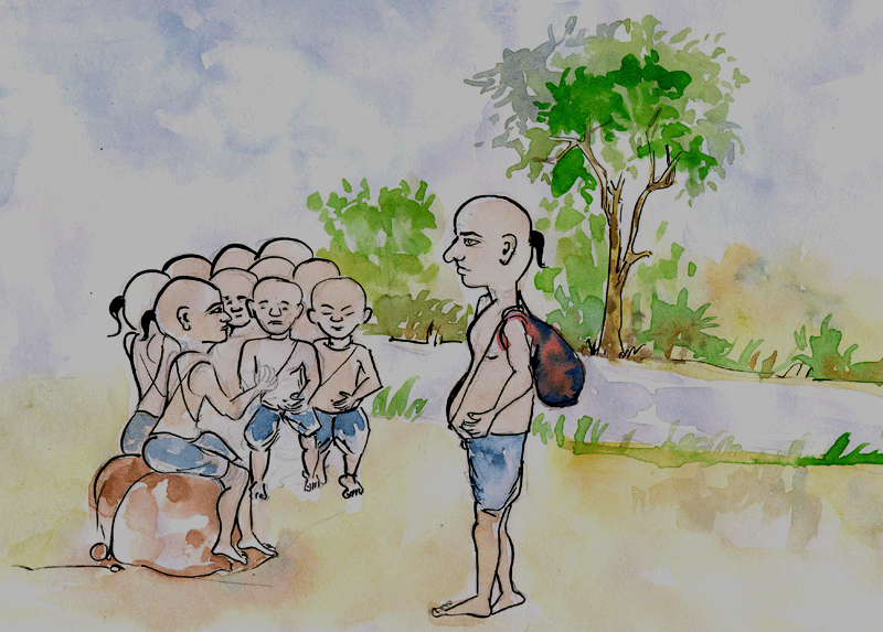 అప్పుడో పంతులుగారు వచ్చారు అటువైపు. తనూ లెక్కపెట్టిచూశారు. పదిమందీ ఉన్నారని నిర్ధారణ చేసుకొని చిరునవ్వు నవ్వారు. ఒక్కొక్కడినీ పిలిచి వీపుమీద బలంగా చరిచారు. దెబ్బపడిన ప్రతివాడినీ తను ఎన్నవవాడో అరవమన్నాడు. ఒకటోవాడినుండీ మొదలెడితే పదోవాడివరకూ అందరూ అరిచారు. పదిమందీ ఉన్నారని అందరూ మహా సంతోషపడ్డారు.