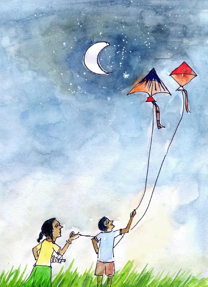 గాలిపటం గాలిపటం ఏల ఎగిరేవు? నేల మీద నడవలేక నింగికెగిరాను! రెక్కలు లేక ఎగిరీ ఎగిరీ ఎక్కడికెళ్తావు? చుక్కల వద్దకు చక్కగ వెళ్ళి చూసి వస్తాను! చుక్కల్లోన చందమామకు చిక్కిపోతావు చందమామకు అందకుండా సర్రున వస్తాను!