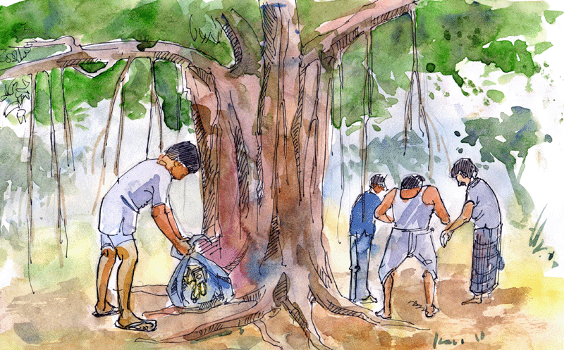 బంగారంతో ఇంటికొచ్చిన భర్తను సంతోషంగా లోపలికి రానిచ్చింది భార్య. "తూకమేసి దాస్తే గుర్తుగా ఉంటుంది" అనుకొని, పేడతప్పిడి వాళ్ళ ఇంటికి వెళ్ళి తక్కెడ తెమ్మంది, భర్తను. తక్కెడ కోసం పోయిన ఇసుక తప్పిడి, మొత్తం విషయాన్ని పేడ తప్పిడి భార్యకు చెప్పేసి మరీ వచ్చాడు.