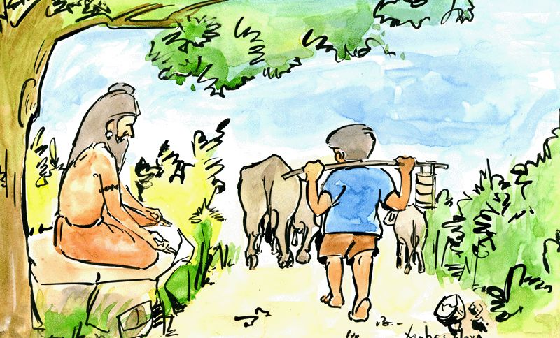 ఆ సమయానికే, పశువులు కాసే పిల్లవాడొకడు, ఋషి కూర్చున్న చెట్టు ముందునుండి పోతున్నాడు. మేపడం కోసం తను అడవికి తోలుకొచ్చిన పశువులను, వాడు ఊరి వైపుకు తోలుకుపోతున్నాడు. అతని దుస్తులు ఏమాత్రం తడిసిలేవు. పొడిపొడిగా ఉన్న బట్టలతో పిల్లవాడు చాలా హుషారుగా పశువుల్ని తోలుకు పోతున్నాడు. పైగా అతను వానమీద ఒక మంచి జానపదాన్ని రాగయుక్తంగా పాడుతూ పోతున్నాడు, కులాసాగా.