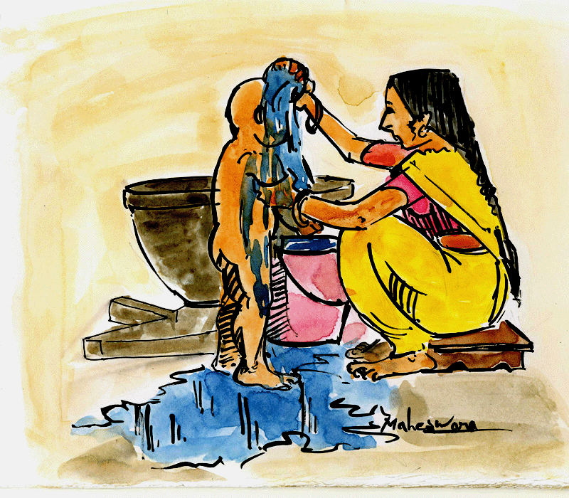 "కళ్లు మండుతున్నాయమ్మా! ఇక నీళ్ళు పోసెయ్, త్వరగా!" అంటున్నాడు పిల్లాడు.