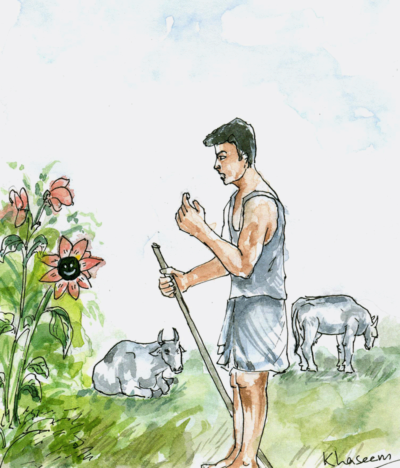 ఇక అతను సంతోషంగా నవ్వుకుంటూ ఆవులు కాసుకోవడానికి వెళ్ళిపోయాడు.