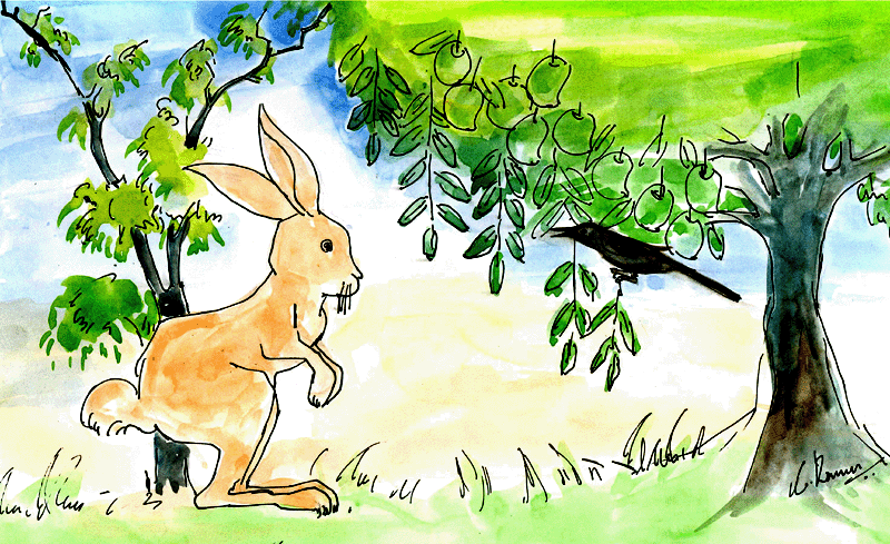 అయితే కుందేలు సంతోషంగా ఎగిరి, నమస్కారాలు పెట్టి, ఉత్సాహంగా ఇంటి వైపుకు పరుగులు తీసింది. దానికి అర్థమైపోయింది- తను వేరెవరో కాదు, తను కుందేలు!" అని.