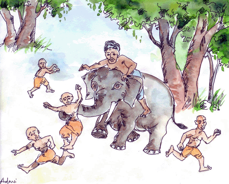 ఒకనాడు ఋషి శిష్యుడొకడు పనిమీద నగరంలోని సంతకు వెళ్లాడు. అక్కడ, ఏనుగొకదానికి మదమెక్కి, అదుపుతప్పి పరుగెత్తటం మొదలెట్టింది. అది ఎటుపడితే అటు పరుగులు తీస్తుంటే దానిపైనున్న మావటివాడు "తప్పుకోండి! తప్పుకోండి! ఏనుగుకు మదమెక్కింది! తప్పుకోండి! పరుగుతీయండి!" అని అరుస్తున్నాడు, నిస్సహాయంగా.