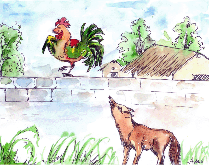 ఒకనాడు కోడిపుంజు రైతు ఇంటి గోడ పైకెక్కి, ’కొక్కొరోకో’ అని గట్టిగా అరుస్తూ కూర్చుంది. దానిని అడవిలోంచి ఒక నక్క చూడనే చూసింది. బాగా బలిసిన ఆ కోడిపుంజును చూడగానే నక్కకు నోరూరింది. ఎలాగైనా కోడిపుంజును రుచి చూడాల్సిందేననుకుంది. మెల్లగా అది కోడిపుంజు నిలబడివున్న గోడ దగ్గరకు వచ్చి, "ఓ కోడిపుంజుగారూ! ఎంత శ్రావ్యమైన కూతండీ మీది! మళ్లీ మళ్లీ వినాలనుందండీ నాకు, మీ కూతని!. నేను రోజూ ఇక్కడికి వచ్చి మీ కూతను వినాలనుకుంటున్నాను. మీకేమైనా అభ్యంతరమా?" అని అడిగింది. నక్క మాటలకు అప్పటికే పొంగి పోయిన కోడిపుంజు "దానికేం భాగ్యమండీ నక్కగారూ! రండి..రండి. రోజూ వచ్చి వినండి. దానికేం భాగ్యం?" అన్నది కులుకుతూ.