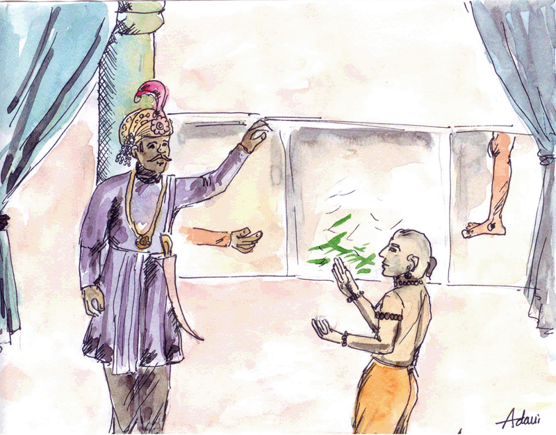 "చిత్రాల్లో వేయనిదాన్ని మీరు ఊహించుకోవాలి" అన్నాడు రామకృష్ణుడు తాపీగా. "మీరింకా నా చిత్రాల్లో అత్యద్భుతమైనదాన్ని చూడనేలేదు" అన్నాడు మళ్లీ. రాయలవారికి ఉత్సాహం పెరిగి, చూపించమన్నారు. రామకృష్ణుడు రాయలవారిని ఒక గోడ దగ్గరికి తీసుకవెళ్లి చూడమన్నాడు గర్వంగా. ఆ గోడ ఖాళీగా ఉంది. ఆకుపచ్చ రంగు గీతలు మాత్రం ఉన్నాయి అక్కడక్కడా.