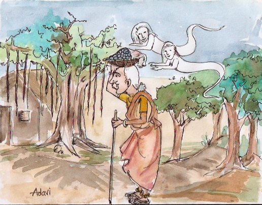 ఉన్నట్టుండి ఊడిపడ్డ రెండు దయ్యాలను చూసి ముసలమ్మ ఖంగుతిన్నది. కానీ లేని గాంభీర్యాన్ని నటిస్తూ- "ఎవరు మీరు? ఏం కావాలి మీకు?" అని ప్రశ్నలు వేసింది దర్జాగా.