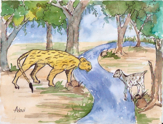మేకపిల్ల అన్నది - "నువ్వు తాగే నీళ్లు నావల్ల ఎలా పాడౌతాయి? నేనేమో కింది వైపున ఉన్నాను - నువ్వు పై వైపున ఉన్నావు!" అని.