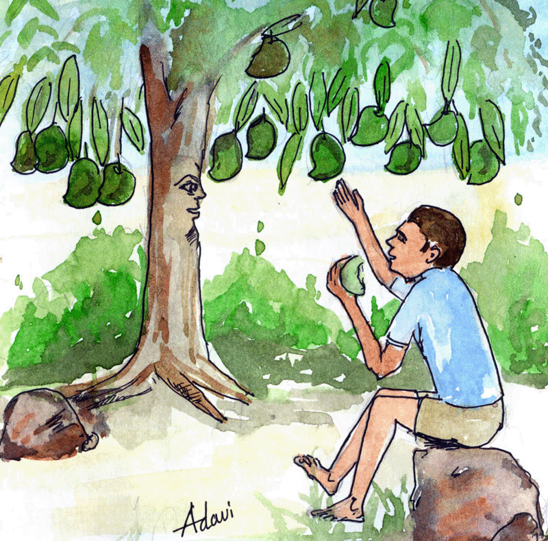 అప్పుడా మామిడిచెట్టు "వేరే ఎవరున్నారు ఇక్కడ? నువ్వే తీసుకో, ఆ బిందెడు బంగారాన్నీ!" అన్నది.