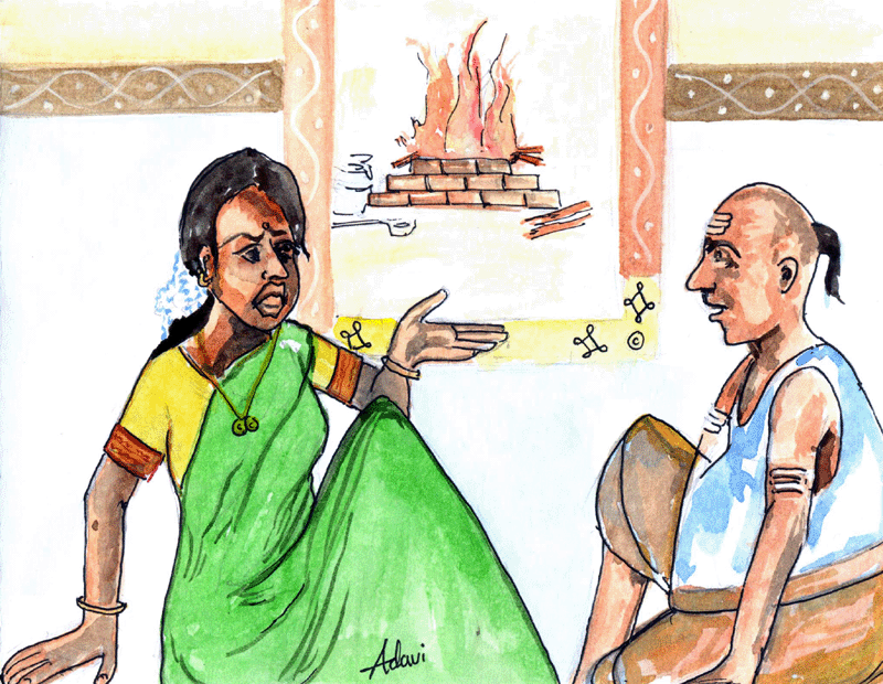 "ఎందుకు? నువ్వు నన్ను అగ్నిహోత్రంలో పోయనివ్వనందుకేనా? అడ్డమైన ప్రతివాడూ ధనికుడై పోతుంటే నువ్వు మాత్రం మమ్మల్ని ఆకలితో మాడిపొమ్మంటున్నందుకేనా? చెప్పు, అందుకే గదా?!" అని ఎగతాళిగా వెటకరించింది, వేసారిపోయిన ఆ భార్య.
