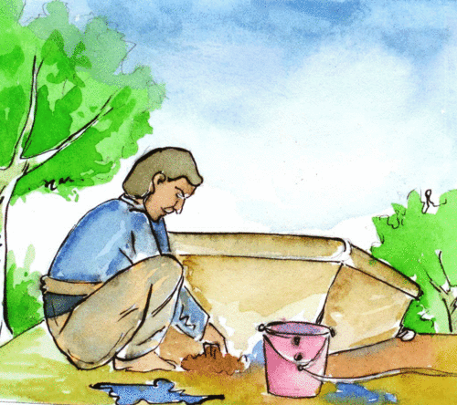 మారన్న పనిలోకి దిగి, ముందు చిన్న తొట్లన్నిటిలోనూ నీళ్ళు నింపాడు. చివరికి పెద్దతొట్టిలో ఒక బిందెడు నీళ్ళు పోసి, రెండో బిందె నీళ్లు తోడేసరికి, పెద్ద తొట్టిలో నీళ్లన్నీ ప్రక్కన తోటలో ఉన్న చెట్లకు చేరుకున్నాయి! తెలివిగల మారన్న ఆ సంగతిని వెంటనే గుర్తించాడు. అతను పనిని ఆపి, చెరువుకు పోయి, ఇంత బంకమట్టి తెచ్చి, పెద్దతొట్టి అడుగున షావుకారు పెట్టిన రంధ్రాన్ని పూడ్చేశాడు. ఆపైన తొట్టి త్వరగా నిండిపోయింది.