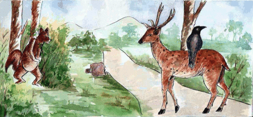 “నాకు ఆ సంగతి ఇంకొంచెం వివరంగా చెప్పు" అని లఘుపతనకం అడిగింది. అప్పుడు హిరణ్యకుడు తన బొరియలోంచే జింక - కాకి కథని ఇట్లా చెప్పసాగింది: