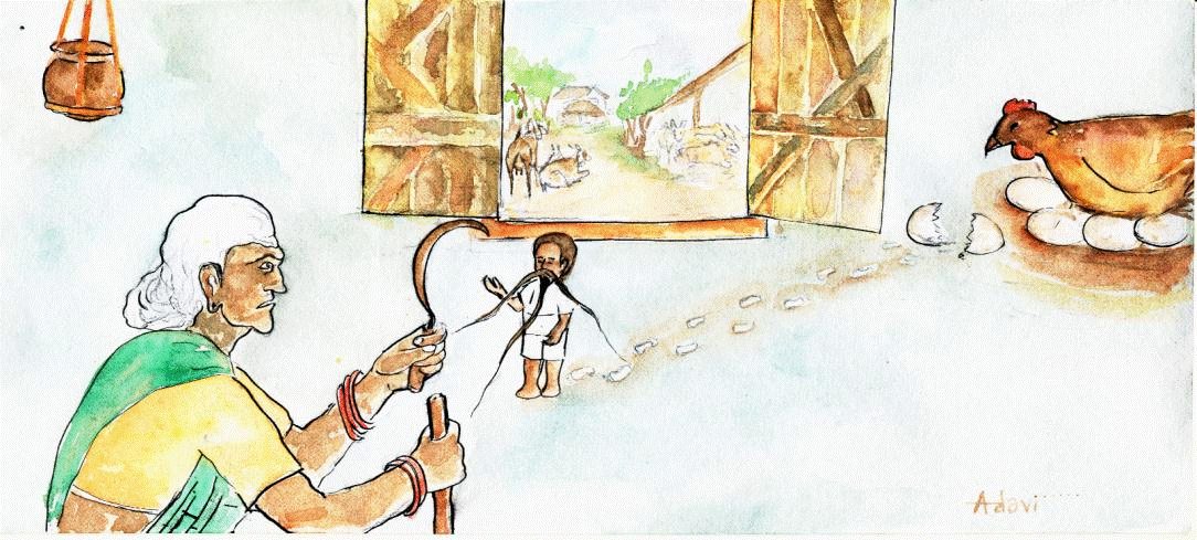ఒక రోజు కోడి ఒక చిన్నగుడ్డు పెట్టింది. ఆ గుడ్డు లోంచి బారెడు మీసం,బారెడు గడ్డం ఉన్న అబ్బోడు బయటకు వచ్చాడు.