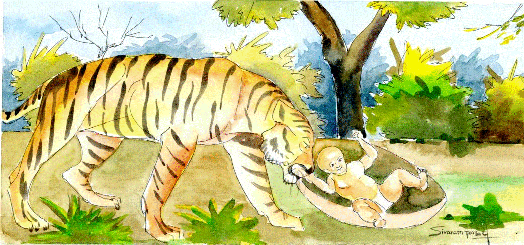 ఇద్దరూ ఆ పసిగుడ్డును అక్కడే వదిలి ఇంటికి వెళ్లిపోయారు. పిల్లవాడు గట్టిగా ఏడుస్తుంటే విని, పులి ఒకటి అటు వైపుకు వెళ్లింది. అది ఆ పిల్లవాడిని నోట కరుచుకొని తన ఇంటికి తీసుకుపోయింది. అక్కడ అది తాగేందుకూ, తినేందుకూ వసతులు ఏర్పరిచి, వాడిని తన సొంత కొడుకులాగా పెంచింది.