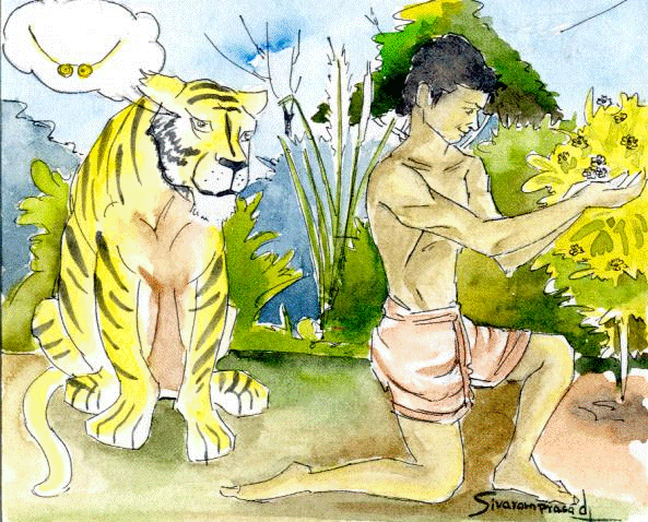 పులి ఉద్దేశం స్పష్టంగా తెలిసిపోయిన భార్యాభర్తలిద్దరూ ఇప్పుడో చెట్టెక్కి కూర్చున్నారు. వాళ్లని వెతుక్కుంటూ పులి ఆ చెట్టుకిందికి రాగానే పులి కొడుకు దానిమీదికి దూకి, చేతనున్న కత్తితో దాన్ని పొడిచి చంపేశాడు.