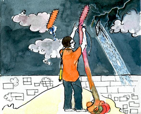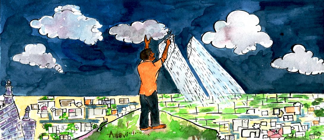 రాత్రయింది- చాలా చీకటి. హోరున వర్షం. ఉరుములు, మెరుపులు- ఆ మెరుపుల వెలుగులో టైలరు ఆకాశానికి రాత్రంతా కుట్లు వేస్తూ పోయాడు. వేల కుట్లు- లక్షలాది కుట్లు వేశాడు.