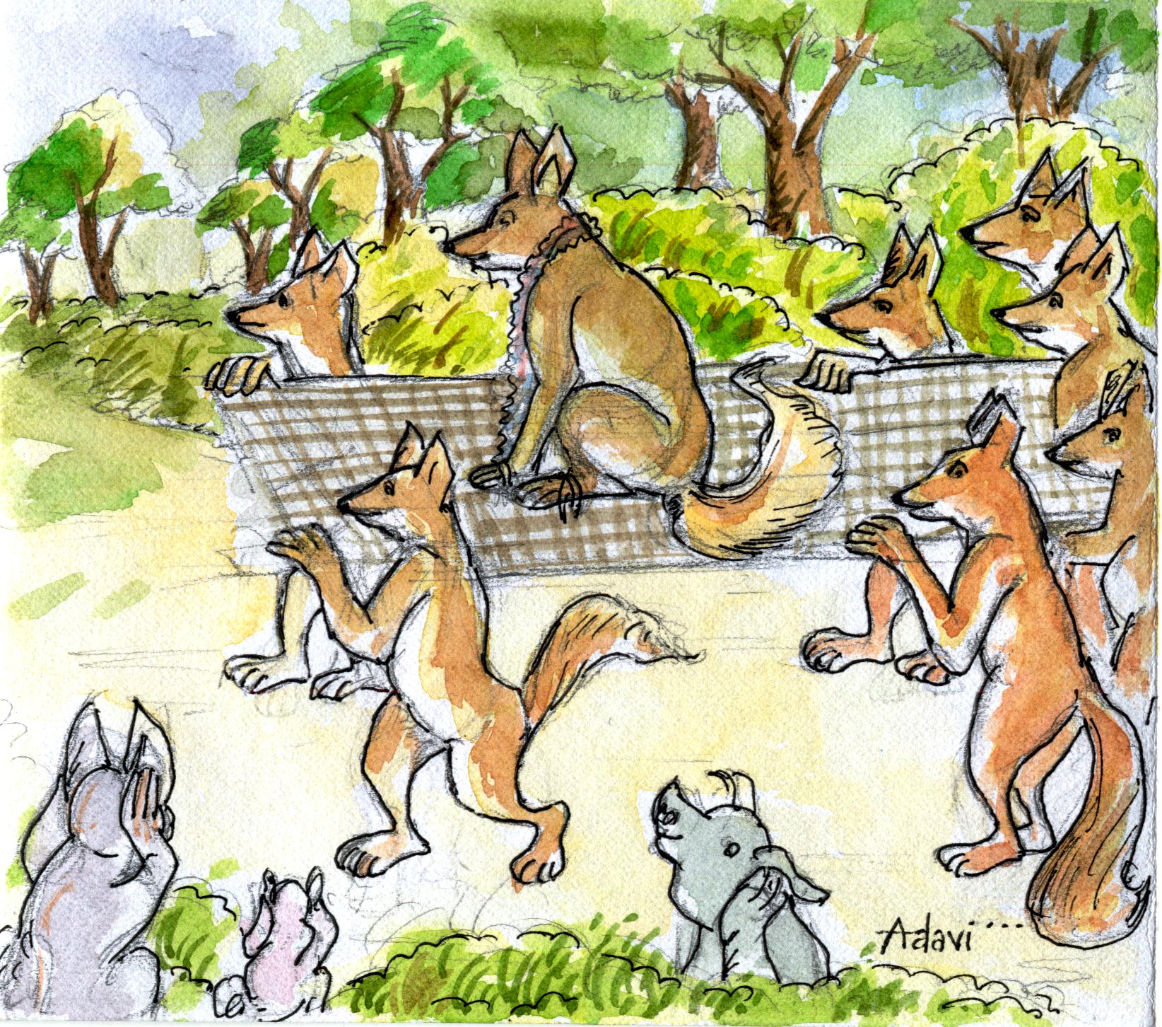 నక్కల గొడవకు చుట్టూ ఉన్న జంతువులన్నీ చెవులు మూసుకున్నై గానీ, సన్మానపు మత్తులో ఉన్న నక్కకు అదేదీ పట్టలేదు. నక్కల ఊరేగింపు సింహం గుహ దగ్గరకు చేరుకునే సరికి, అప్పటికే ఆకలితో చికాకుగా ఉన్న సింహం దిక్కులు పిక్కటిల్లేట్లు గర్జించింది. మరుక్షణం నక్క మిత్రులన్నీ తడకను క్రిందపడేసి తలో దిక్కుకూ పరుగులెత్తాయి. తడకకు కట్టబడి ఉన్న నక్క ఎటూ పారిపోలేక ఏడవసాగింది. దిక్కులు తెలీనట్లు పరుగెత్తుతున్న మిత్రుల కాళ్లక్రింద పడి దానికి నడుం విరిగినంత పనైంది.