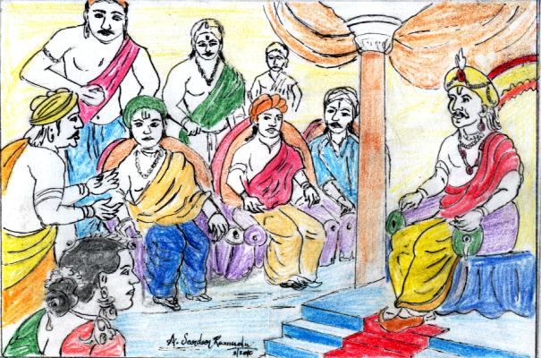 ఆమె వాళ్ళు వచ్చిన పనిని తెలుసుకొని, వాళ్లందరికీ అన్నం పెట్టి, వాళ్లతోబాటు తన భర్త పులికేశవనుకూడా గొప్పవాళ్లను చూసివచ్చేందుకు పంపింది. అలా నలుగురూ దేశాలు పట్టుకొని వెళ్తుండగా చీకటిపడింది. వీళ్లు నలుగురూ 'ఎల్లాల' అనే గ్రామంలో పడుకుందామని వెళ్ళారు. అక్కడ ఒకతను ఓ మైదానంలో నిలబడి ఎటో దీక్షగా చూస్తూ కనబడ్డాడు. అతను తనలోతాను నవ్వుకుంటుండటం చూసి- "ఇతనెవరో పిచ్చివాడిలాగా ఉన్నాడు- పాపం ఏవో కలలు కంటున్నట్లున్నాడు" అనుకున్నారు వాళ్లు ఎగతాళిగా.