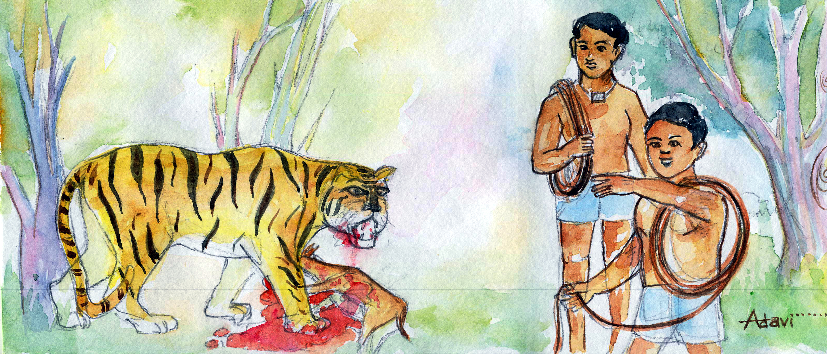 పులి ఇంకా ఆశ్చర్యపోయింది. 'వీళ్ళకు పులిభాష ఎలావచ్చు?' అని. అది వాళ్ళను ముట్టుకొని చూస్తే, నిజంగానే వీళ్లిద్దరికీ పెద్దగా కండ లేదు. 'కండ ఎక్కడుంటుందిలే, పులికి ఇచ్చేశాం కద!' అన్నాడు రవి దానితో, మళ్ళీ.