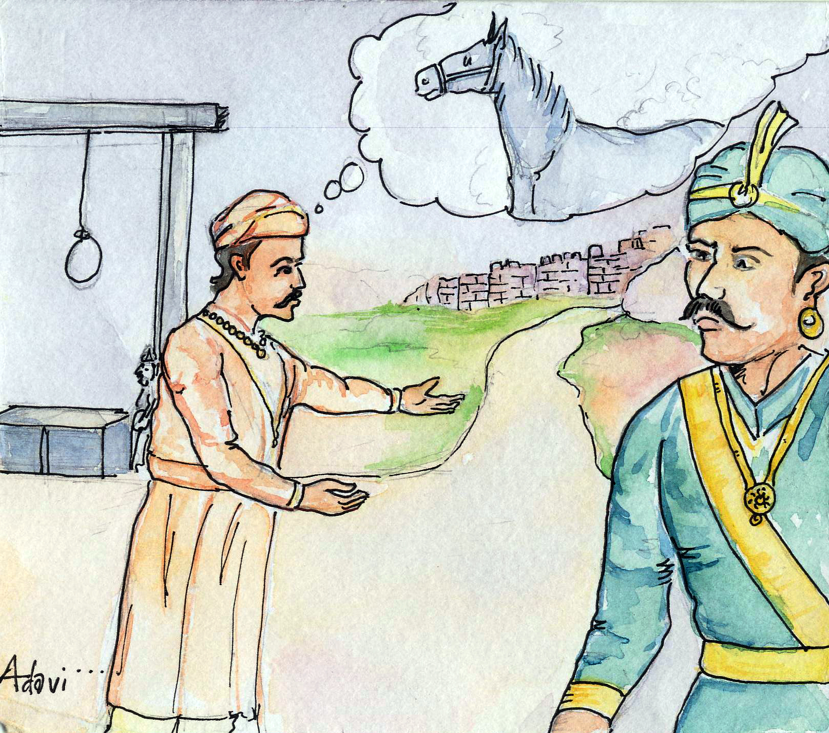 " 'ఒక సంవత్సరం పట్టవచ్చు' అన్నాను నేను. ఆయన నన్ను విడుదల చేసి, నాకు ఈ గుర్రాన్నిచ్చేశారు- 'సంవత్సర కాలంలో ఈ గుర్రాన్ని గాలిలో ఎగిరించగల్గితే నీకు నీ ప్రాణాలే కాదు, నా రాజ్యంలో 4వ వంతు ఇచ్చేస్తాను' అన్నారు!
