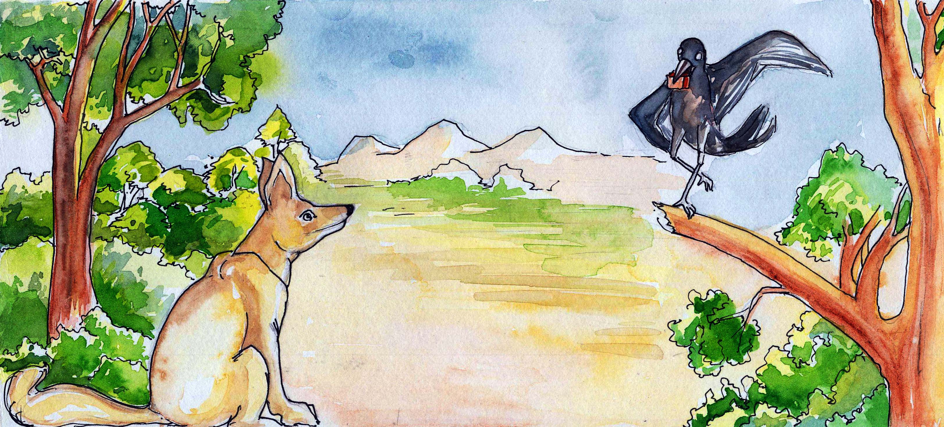 ఒక అడవిలో చాలా తెలివైన కాకి ఒకటి ఉండేది. దానికి ఒకరోజున మాంసపు ముక్క ఒకటి దొరికింది.
