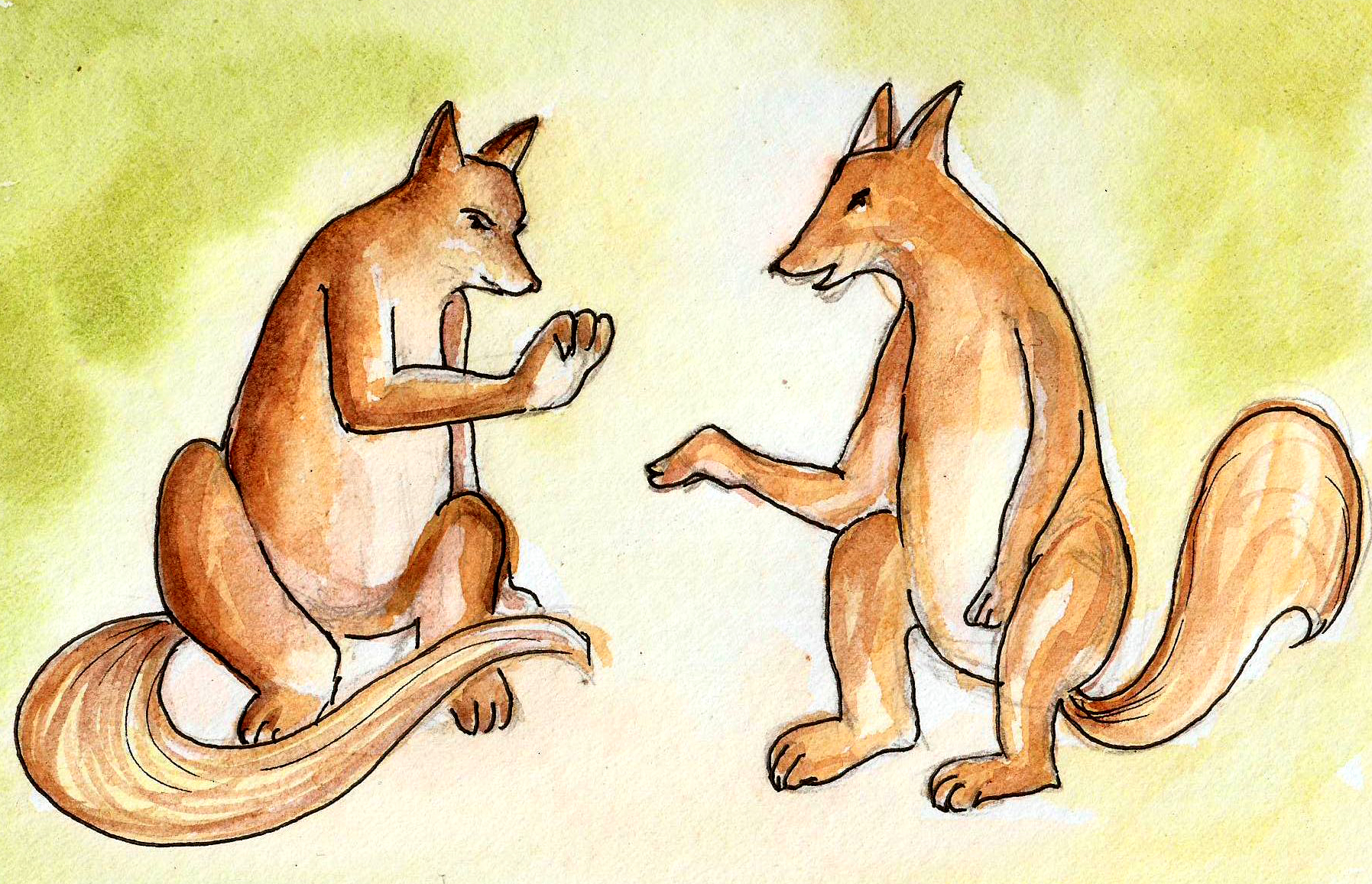 వెంటనే దమనకుడు పింగళకుడి దగ్గరికి పోయి, చాలా అణకువతో ఒదిగి నిల్చొని, భయభక్తులు ఉట్టిపడేటట్లు కంగారు పడుతూ, నమస్కారం చేసింది. ఆ సింహరాజు అప్పుడు దానిని గౌరవం నిండిన చూపులతో ఆహ్వానించి, కూర్చొనమని, "బాగున్నావా? చాలా కాలమైంది, నిన్ను చూసి!" అన్నది.