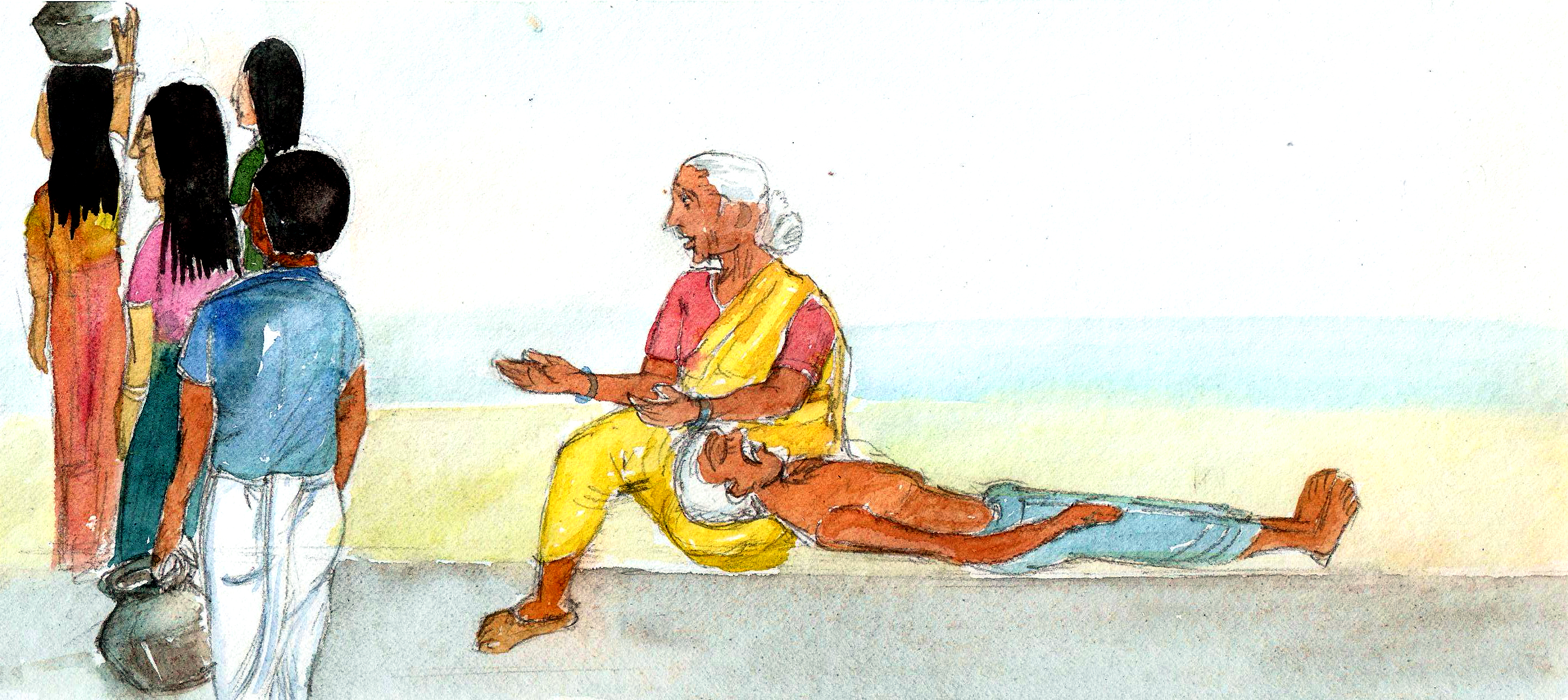 అవ్వ అన్నది- "కాస్త ఆగు నాయనా! ఆయన నోట్లో నీళ్ళు పోసేముందు, నువ్వు చేసిన పుణ్యకార్యాల్లో ఏదో ఒకటి చెప్పి, ఆ పైన నీళ్ళు పొయ్యి బాబూ! నీ పుణ్యంవల్లనైనా ముసలాయన మంచి లోకాలకు పోతాడు" అని.