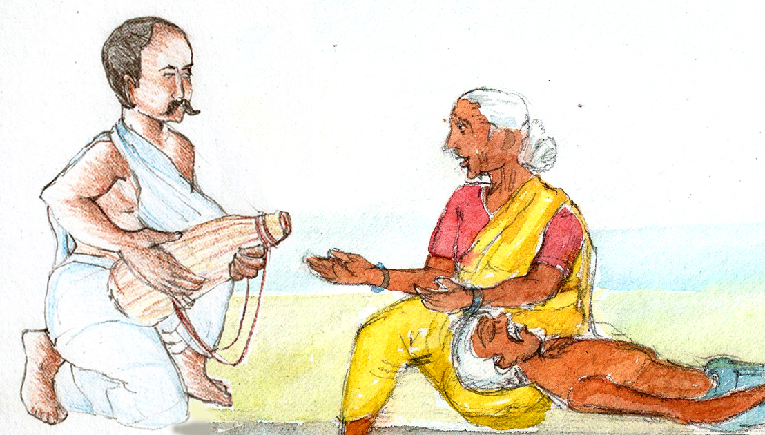 దొంగ చేతిలో ఒక సొరకాయ బుర్రనిండా గంగ నీళ్ళు ఉన్నాయి. అతను "దానిదేముంది అవ్వా, ఇప్పుడే తెచ్చుకున్నాను గంగ నీళ్ళు- ఇవిగో!" అని ఆ నీళ్ళను ముసలాయన నోట్లో పోసేందుకని మోకాళ్ళపైన కూర్చున్నాడు.