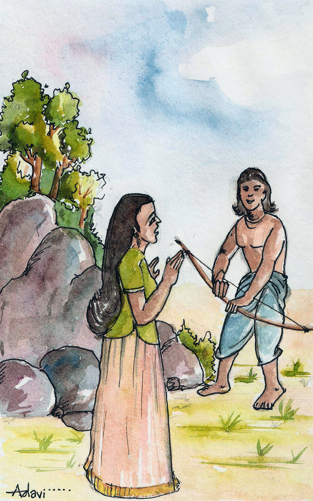 అలా వాడికి పన్నెండేళ్ళు వచ్చాక, ఒకరోజున అడవిలో తిరుగుతుండగా అతనికి ఒక పాడుపడిన ఉద్యానవనం కనిపించింది. అందులో దేవత విగ్రహం ముందు మోకరిల్లి, అతను "తల్లీ! నాకు తోడు నీడగా ఉండేటట్లు ఎవరైనా నేస్తాన్ని ఇవ్వు" అని కోరుకున్నాడు. అలా అనుకున్న మరుక్షణం అతనంత వయస్సులోనే ఉన్న ఒక అమ్మాయి అక్కడికి నడుచుకొని వచ్చింది! ఆమె సహాయంతో యువరాజు చదువు నేర్చుకోవటమే కాక, అనేక విద్యలలో ప్రావీణ్యత సంపాదించాడు.