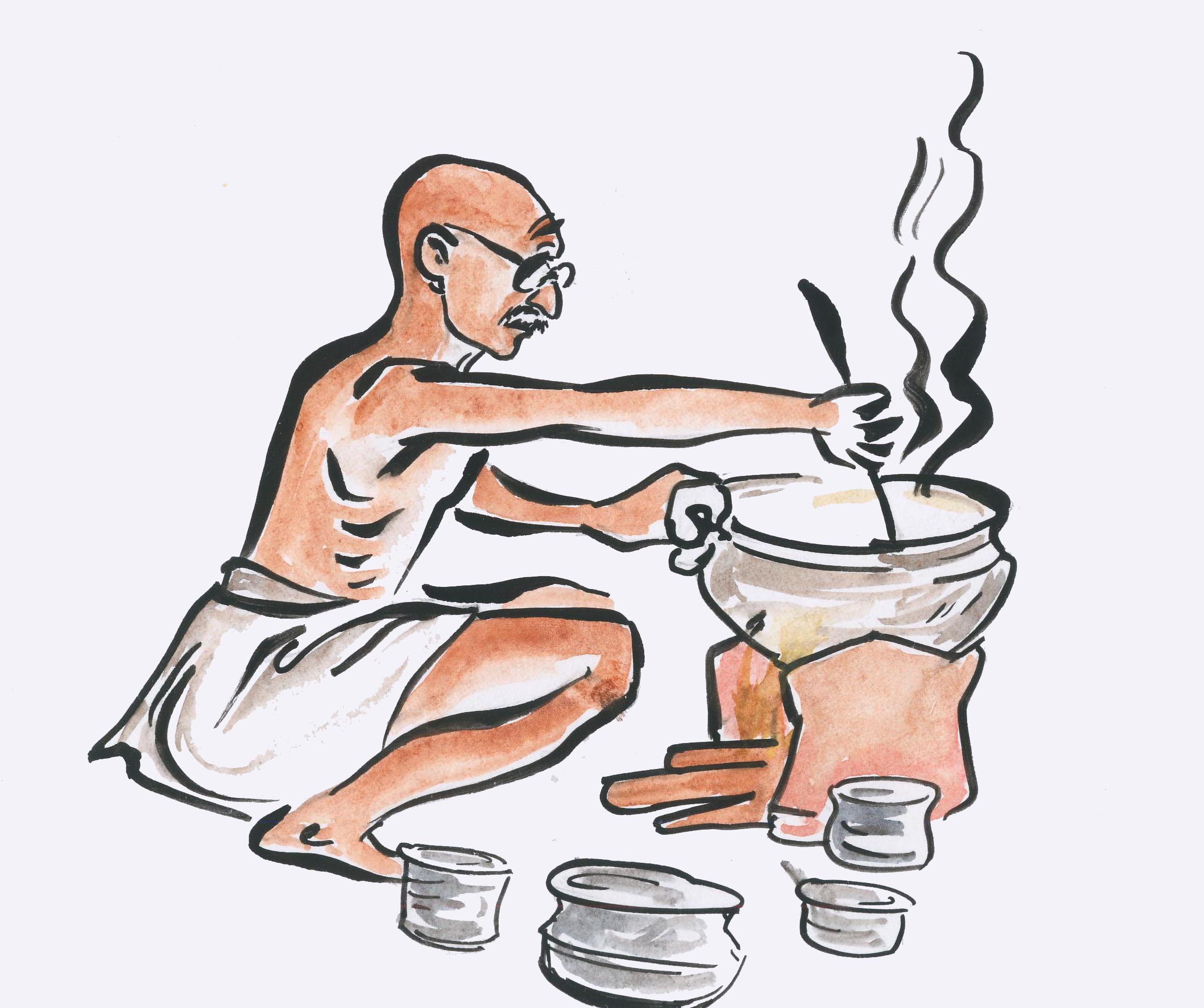 దక్షిణాఫ్రికాలో గాంధీ ఆశ్రమంనుండి సత్యాగ్రహులు జట్లు జట్లుగా వెళ్ళి నిరసన వ్యక్తం చేసి, పోలీసుల చేత దెబ్బలు తినేవాళ్ళు. అలా జట్టు బయలుదేరిన ప్రతిసారీ, వాళ్లకు స్వయంగా తన చేతుల్తో కాల్చిన రొట్టెలు, టమేటా పచ్చడి, అన్నం, కూర, ఖర్జూరాలు పెట్టేవాడు గాంధీ. ఒకవైపున ఆయన చేతులు చకచకా వంట పని చేస్తుంటే, అయన నోరు మాత్రం వాళ్లకు 'సత్యాగ్రహి జీవితం ఎట్లా ఉండాలి, జైల్లో ఎట్లా జీవించాలి'-అని పాఠాలు చెబుతుండేది.