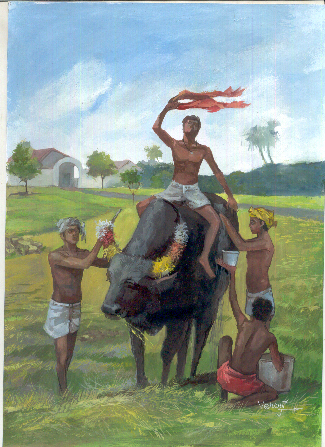 బడి బయట నలుగురు పిల్లలు- ఒక బర్రె చుట్టూ చేరి సందడి చేస్తున్నారు. నలుగురికీ చొక్కాలు లేవు. వాటిని విప్పి తలకు చుట్టుకొని ఉన్నారు. ఒకడు బర్రెమీద ఎక్కి అటూ ఇటూ కాళ్ళు వేసుకొని, దాన్ని పట్టుకొని, గుర్రం తోలినట్లు 'చల్! చల్!' అంటున్నాడు. మరొకడు దాని కొమ్ములకు రంగు కాయితాలు అంటిస్తున్నాడు. మిగిలినవాళ్లు ఇద్దరూ బర్రెకు నీళ్లు పోస్తున్నారు సంతోషంగా. వీళ్ల సేవలందుకుంటూ అది కదలకుండా నిలబడి, తృప్తిగా చూస్తున్నది.
