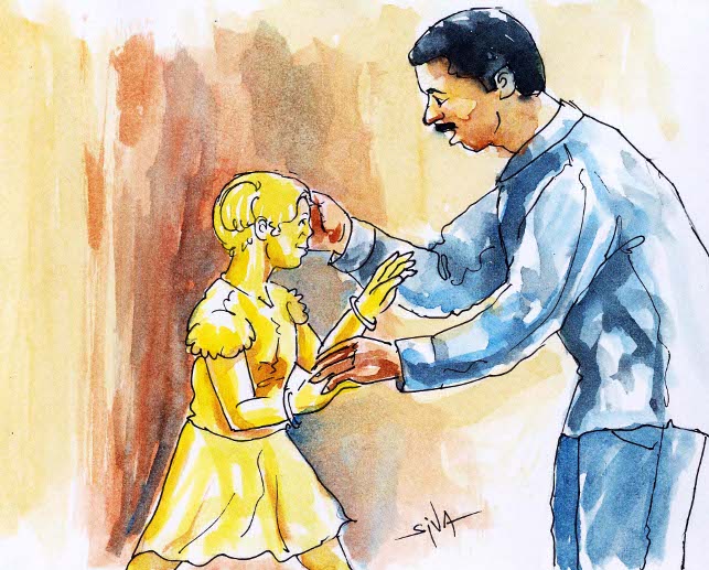 అంతలోనే భూపతి కూతురు బడి నుంచి వచ్చింది- భూపతిని చూడగానే ఆ పాప "నాన్నా!" అని అరుచుకుంటూ దగ్గరికి వచ్చింది. భూపతి ఒక్క క్షణం పాటు తన బాధను మరిచిపోయి, ఆ పాపను ఎత్తుకుని ముద్దు చేయబోయాడు- అంతే- ఆ పాప కూడా బంగారు బొమ్మ అయిపోయింది- ఎంత పిలిచినా ఉలకదు, పలకదు!