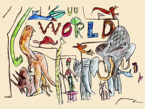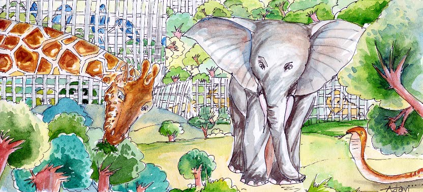అది ఒక జంతు సంరక్షణ శాల. అందులో అన్ని జంతువులూ సైజుల వారీగా వేరు వేరు బోనుల్లో ఉన్నాయి. కానీ డైనోసార్, జిరాఫీ, ఏనుగు మాత్రం ఒకేచోట ఉన్నై. జిరాఫీ చెట్టు ఆకులను తినేందుకు ప్రయత్నిస్తోంది.