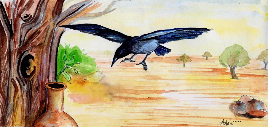 అనగనగా ఒక అడవిలో ఒక కాకి వుండేది . ఒకసారి అది చుట్టాల ఇంటికి వెళ్ళింది. కొన్ని రోజులు సరదాగా గడిపి, ఇంటికి బయలు దేరింది. కాకులు మామూలుగా ఎక్కువ దూరం పోవు. అయితే ఈ కాకి చాలా దూరం పోయింది గదా, అందుకని దానికి దాహం వేసింది . దగ్గర్లో ఏదైనా చెరువు గాని, కాలువ గాని వున్నదేమోనని వెతికింది. ఎక్కడా నీళ్ళు లేవు! పైపెచ్చు అది ఎండాకాలం- అందుకని చిన్న చిన్న గుంటలన్నీ ఎండిపోయి ఉన్నాయి!