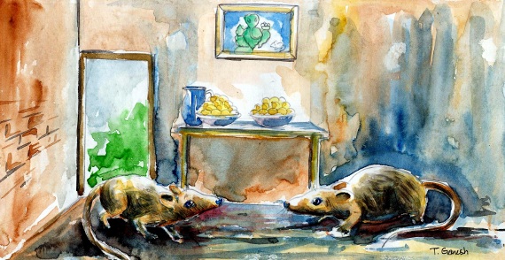 అవి అక్కడి నుండి చూస్తూండగానే ఇద్దరు మనుషులు లోనికి వచ్చి, మెల్లగా భోజనం చేసి వెళ్ళారు. వాళ్ళు వెళ్ళగానే మళ్లీ వంటకాల దగ్గరికి చేరాయి ఎలుకలు. ఇంకా దేన్నీ రుచి చూడనే లేదు- మళ్ళీ అలికిడైంది! ఈసారి ఇంకా ఎక్కువ మంది మనుషులు లోనికి వచ్చారు.