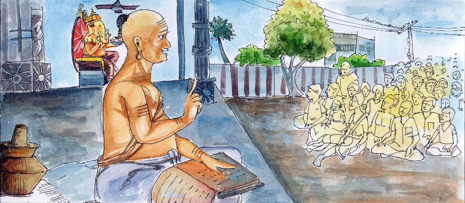"అయ్యో! ఎంతపని చేశావు! వినటం రాకపోతే ఇట్లాగే ఉంటుంది! ఉపన్యాసం మధ్యలో ఇక ఏం చెప్పాలో గుర్తు రాక, వంకాయ గురించి మొదలు పెట్టాను. ఎంత ఆలోచించినా తర్వాతి శ్లోకం గుర్తురాలేదు మరి- ఏం చెయ్యను? అందుకని వంకాయ మీద యుద్ధాన్ని కొనసాగించేశాను!. ఇన్నేళ్ళ కాపురం తర్వాతకూడా నన్ను అర్థం చేసుకోకపోతే ఎలాగ? ఉపన్యాసాన్ని నువ్వు ఈ చెవిలోంచి విని, ఆ చెవిలోంచి వదిలెయ్యాలి- నిజానికి ఉపన్యాసాలు వినేవాళ్ళంతా చేసేది ఆ పనే కదా, అంతమాత్రం తెలీదా?" అని బాధ పడ్డారు పండితులవారు- చెత్తకుప్పలోకి అన్యాయంగా చేరుకున్న వంకాయకూరను తలచుకుంటూ!